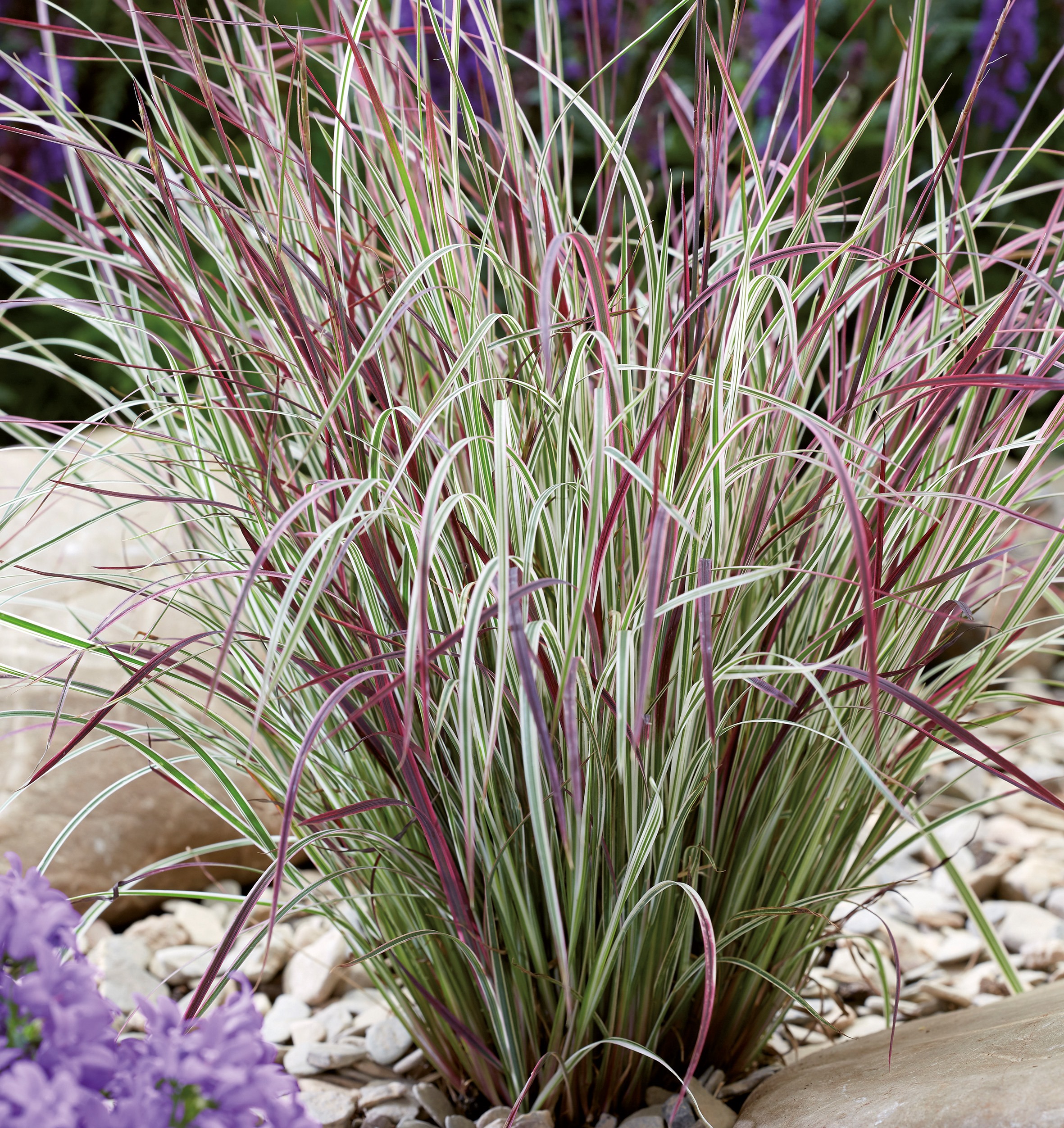 Le Barbon à balais est une jolie graminée au feuillage lumineux vert et blanc crème se parant de rose pourpre en fin d'été. Un bel effet graphique pour vos massifs de terrain sec.